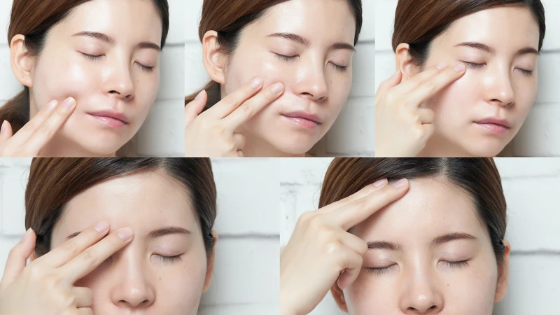 在臉部的5個重要穴點—地倉穴(嘴角外緣)、迎香穴(鼻翼外緣)、承泣穴(眼下)、攢竹穴(眉頭)及神庭穴(額上髮際中央),使用指腹拉提引流按摩,達到疏通的效果。