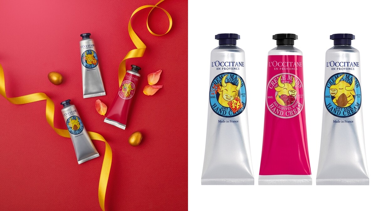 迎接2021金牛年,L’OCCITANE特別推出「乳油木護手霜」牛年限量版包裝!每兩秒銷售一條的乳油木護手霜,蘊含20%乳油木果油,迅速吸收不黏膩,有效舒緩因頻繁洗手和消毒而乾裂的雙手。新春推出三入組禮盒,包含二支經典乳油木護手霜30ml及一支乳油木玫瑰護手霜30ml,包裝上分別印有拿著福字春聯、簇擁著玫瑰花束和擁抱著乳油木果的金牛,實在太可愛。