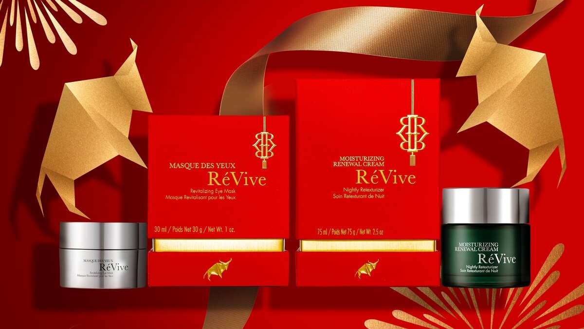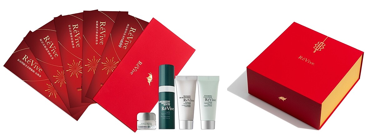 RéVive首度推出「光采奢華紅」限量包裝,將經典熱賣明星商品、新春拜年好氣色必擦的光采再生活膚霜,以及急救過年熬夜必備、用過回不去的賦活晚安眼膜,換上新春限定版喜氣牛年限量包裝。質感絲絨紅色設計,點綴耀眼金黃色燈籠、元氣金牛圖騰,傳遞吉祥福氣、喜慶開運,更同時全面為肌膚助陣開光,驅黑去黃、再現柔嫩亮白。