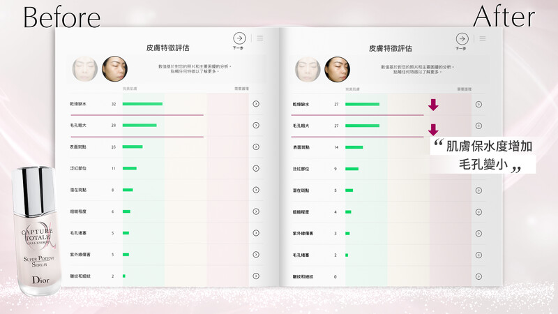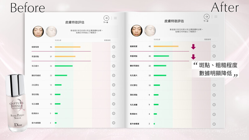 小吳在旁親眼見證Yoyo皮膚的Q彈變化,徹底被推入迪奧坑!Yoyo使用膚測儀前,皮膚雖不算差,但就是比較暗沉,觸摸臉時感覺有點粗粗的不滑順,開始使用DIOR逆時能量精華+乳霜之後,隔日就可以感受到肌膚開始變得柔嫩,一週明顯還沒上妝前就透出明亮光采,尤其是斑點、粗糙程度兩大指數明顯改善、肌膚保水度也增加!大讚DIOR逆時能量精華根本全能、是不怕挑戰的7日速效精華!