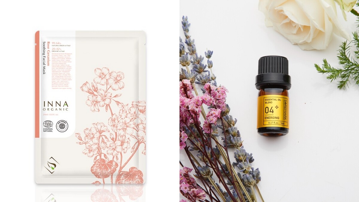 童顏有機玫瑰天竺葵修護舒敏隱形面膜:有機玫瑰天竺葵複方精油、蘆葦花/茯苓萃取,搭配日本獨家冰羽靈隱形面膜布,幫助舒緩肌膚。