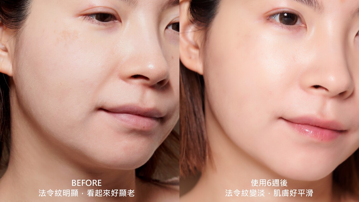 使用前後法令紋對比:討厭的紋路明顯變淡,肌膚不僅變平滑,臉看起來好澎潤好年輕呀,整個人也更有精神!