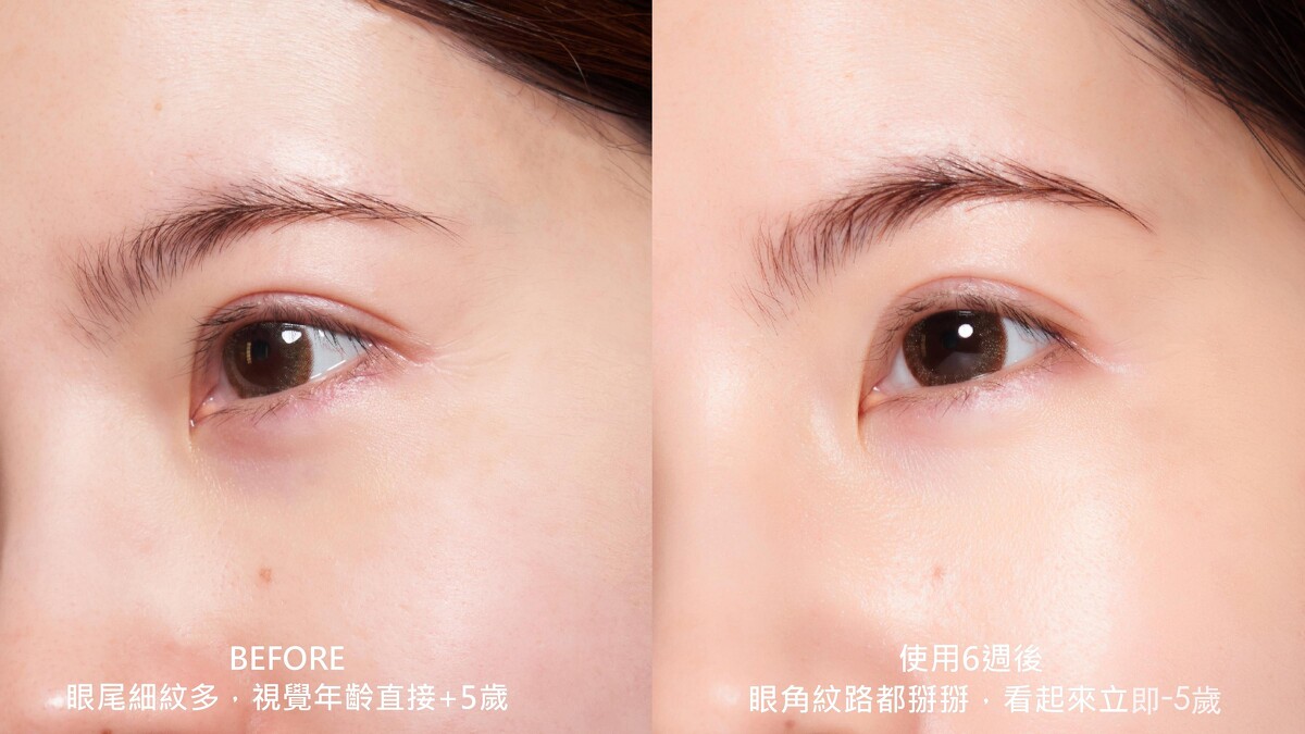 使用前後眼周細紋對比:用保養也能讓眼尾的紋路消失,完全不用去醫美就能變年輕,視覺年齡瞬間-5歲,讓我好顯嫩。