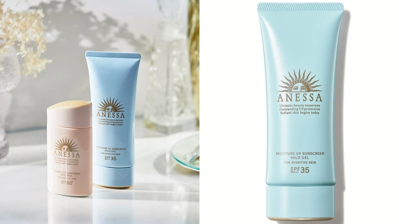 安耐曬 2021年推出兩款新品,專為敏弱肌設計的質地,主打無添加酒精、無香料、無色素,同時加入高達50%保養成份,例如牡丹根萃取、超級玻尿酸、甘草、甘油等,長時間保有保濕舒適膚觸。
