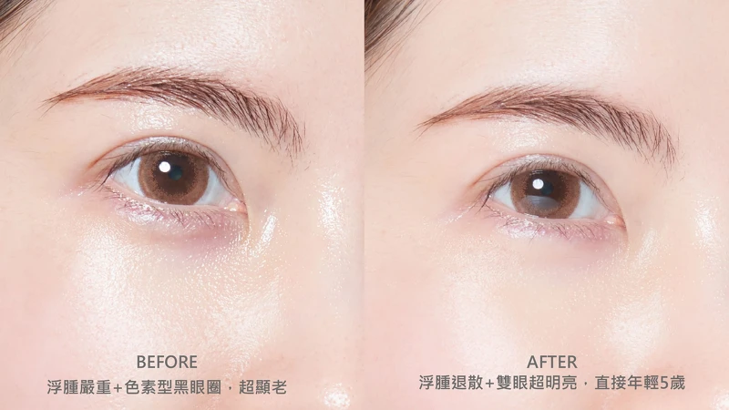 不難發現,原本的黑眼圈+泡泡眼問題通通退散,雙眸好像睡飽8小時般明亮有神、眼下肌膚細緻又光滑,看起來立刻年輕5歲不誇張。