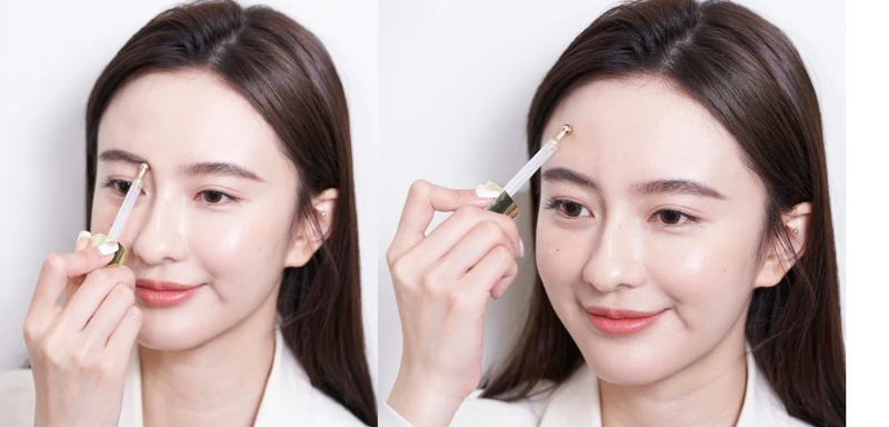 Step2 彈壓:像彈鋼琴般輕輕彈壓黃金冰滴於眼下肌膚,促進循環,眼神會瞬間亮起來,精神一起變好!