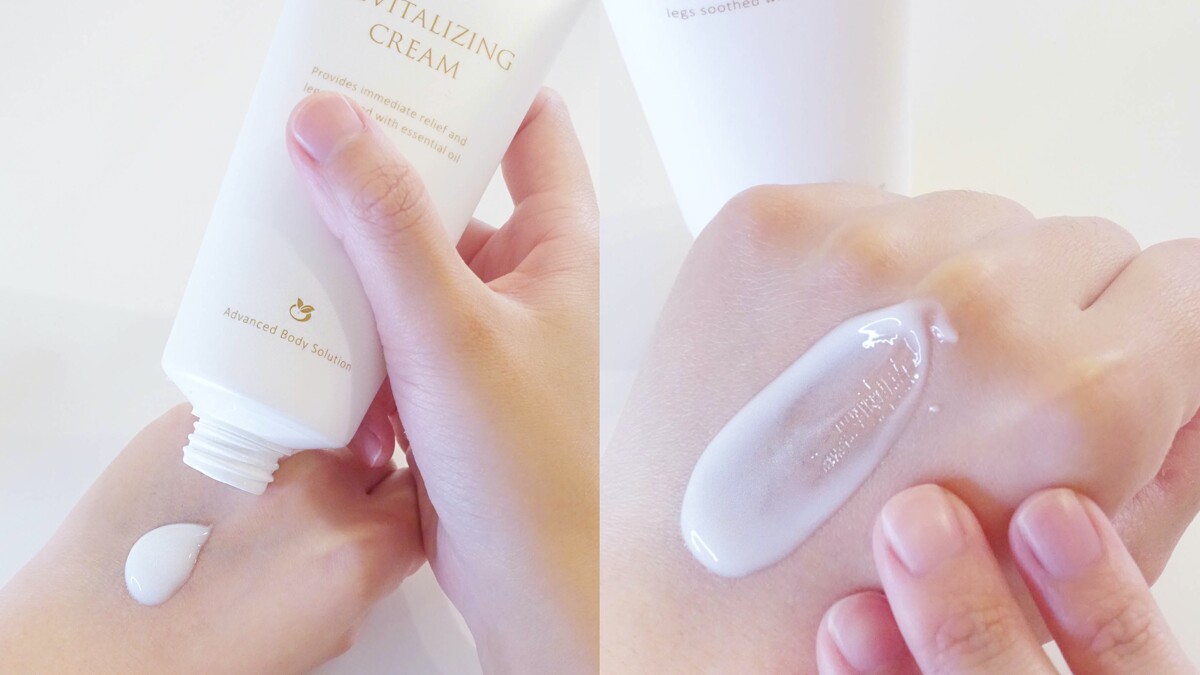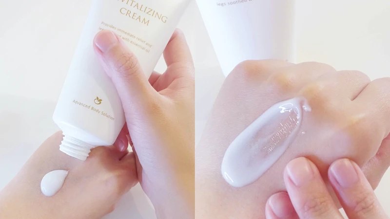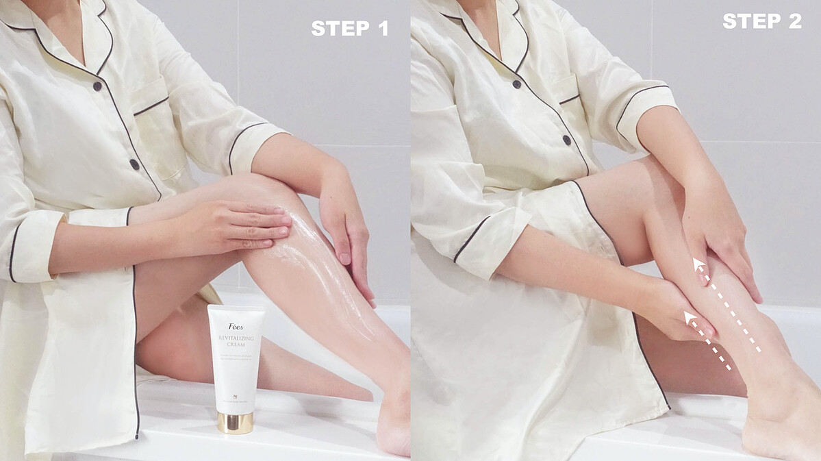 STEP 1.使用適量美腿舒活霜在手掌上,順著腳踝到膝蓋由下而上按摩小腿到吸收。