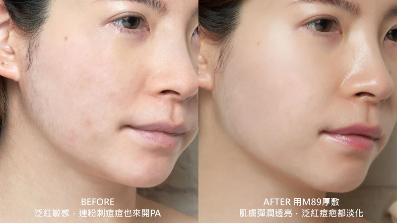 覺得肌膚泛紅熱熱der、甚至感覺痘痘快要長出來…這時拿出M89厚敷5分鐘(可拍打至吸收,或用化妝水稍微擦拭),敷臉過程可以感覺涼涼的好舒服、立即舒緩鎮靜肌膚,連泛紅都不見,瞬間安撫你的不乖肌。長期使用增強肌膚屏障能力,泛紅減少,肌膚好彈潤好透亮。