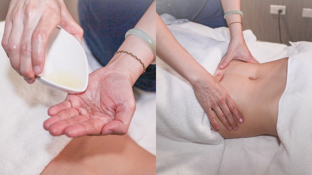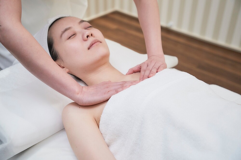 30分鐘課程先以荷荷芭油滋潤調理肌膚開啟序幕,運用大姆指指腹往胸部中心滑推,從右而左沿著胸型從下緣、側邊、上方至中央輕揉舒展筋膜,緩解緊繃肌肉,緊接著改以雙手輕撥,特別加強腋下淋巴處。美容師輕微搖晃胸部舒緩乳腺,喚醒停滯循環或因孕期產生的腫脹,塑造胸型飽滿膨潤,再以手掌由下往上、由外往內提拉胸型,最後按摩平時不易運動到的胸下肋骨與肋骨間肌肉,推開沾黏與僵硬。透過溫柔推撥手法取代按壓穴點的疼痛,讓整個課程都很享受。