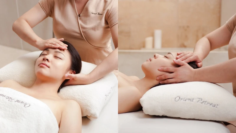3.Delta慢波按摩-Delta屬於大腦頻率最慢的波,使用溫熱紫晶眼枕讓雙眼放鬆,並透過芳療師雙手於後腦枕與前額掌心進行顱腔深度按摩,讓頭部進入休息狀態的慢速波。