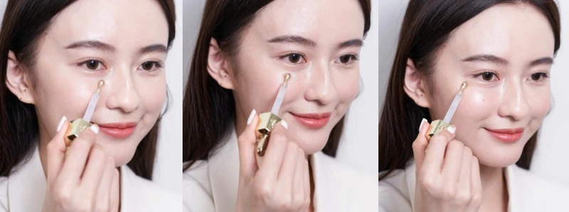 Step2 彈壓:像彈鋼琴般輕輕彈壓黃金冰滴於眼下肌膚,促進循環,眼神會瞬間亮起來,精神一起變好!