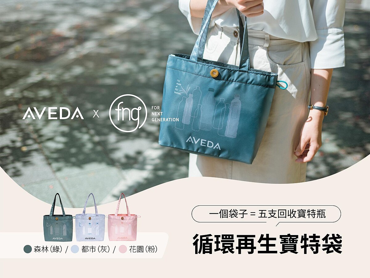 2021年AVEDA《胖胖瓶減塑回饋企劃》特別與FNG世代設計合作推出「循環再生寶特袋」,從鈕扣到袋子本體皆使用同一種塑膠材質,加速落實「循環再生」。每一個袋子可讓五支回收寶特瓶被重新利用。