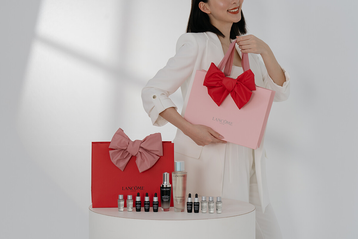你送禮物的心意十足、蘭蔻寵粉的誠意也十足!鐵粉都知道只要有優惠檔期,必搶蘭蔻「極光水」與「小黑瓶」!4/30-5/9只要消費滿NT.5,299(我愛久久)「浪漫蝴蝶結禮袋」就免費送給你,共推出粉紅、粉桃兩色,華美的手工蝴蝶結包裝,讓禮物袋本身就像夢幻精品!