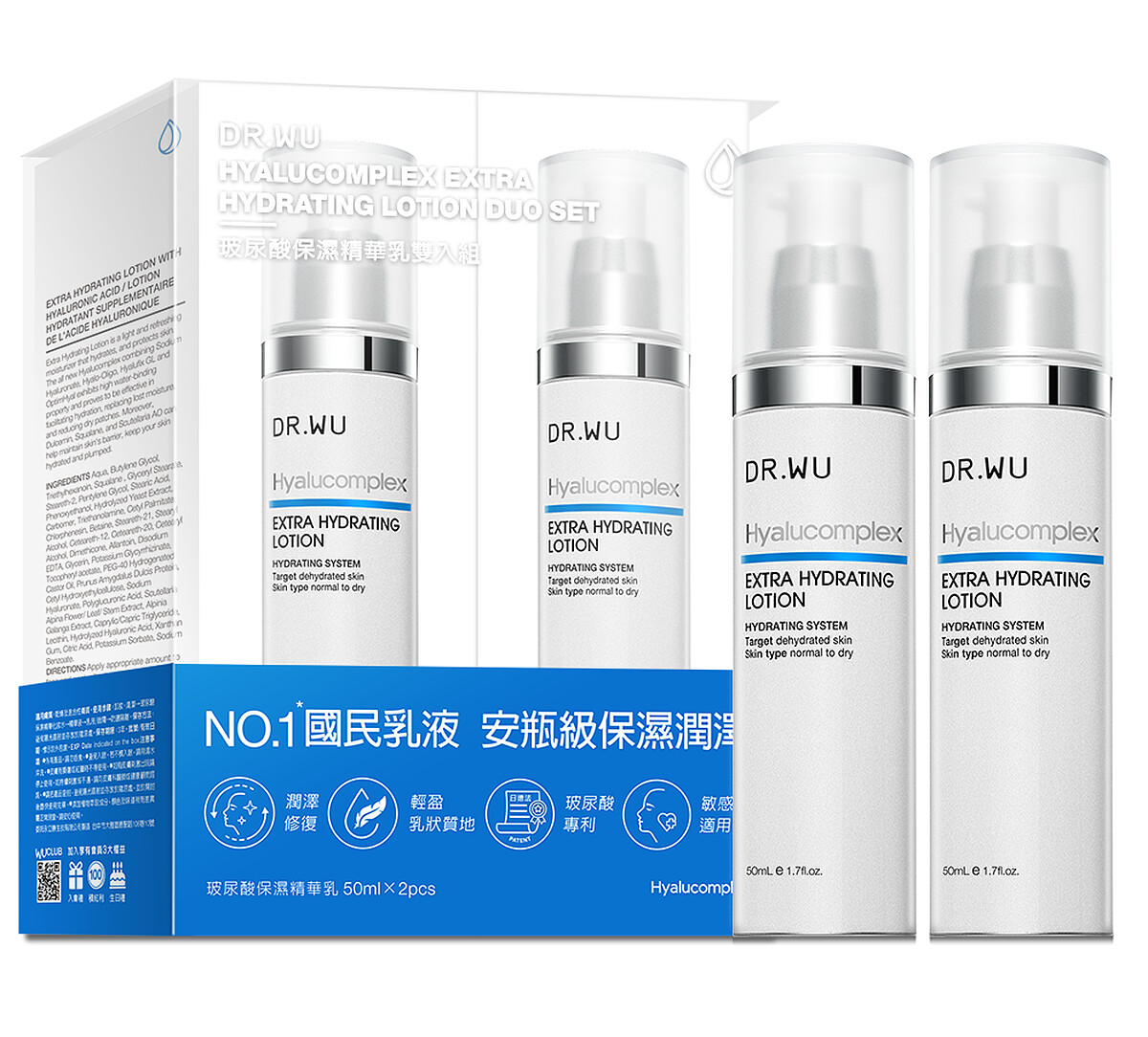 寵愛媽咪更要呵護自己!夏日即將到來,乾肌與敏感肌的消費者,常常陷入想要清爽保養,又怕保濕不夠長效的兩難!DR.WU推出【玻尿酸保濕精華乳雙入組】,內有鐵粉空瓶無數,被網友暱稱「國民乳液」的玻尿酸保濕精華乳*2,絕對必收價$999,獨家奶油乳狀質地,超輕盈潤澤,一抹化水瞬吸收!搭配獨家專利「智慧型肌因活水科技」,選用日德法三國專利玻尿酸,補水、保水、活水、鎖水一次完成,打造安瓶級長效保濕力!肌膚全天候24小時滿水位,打造澎潤水光肌。