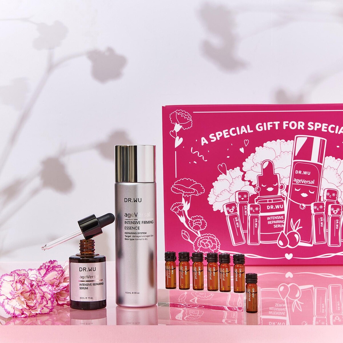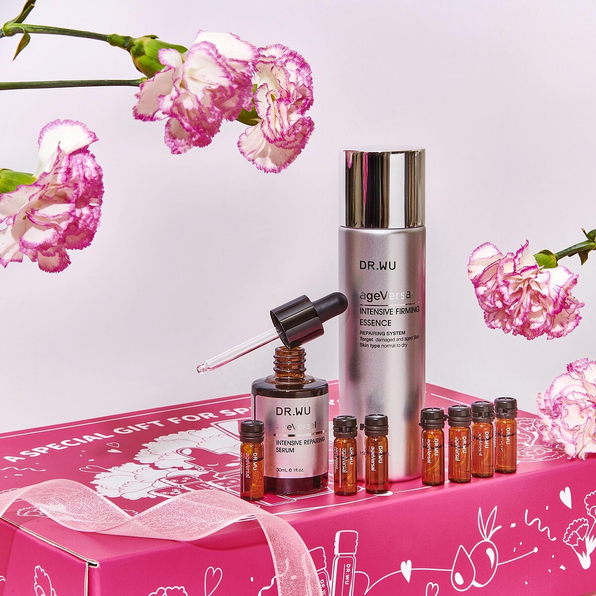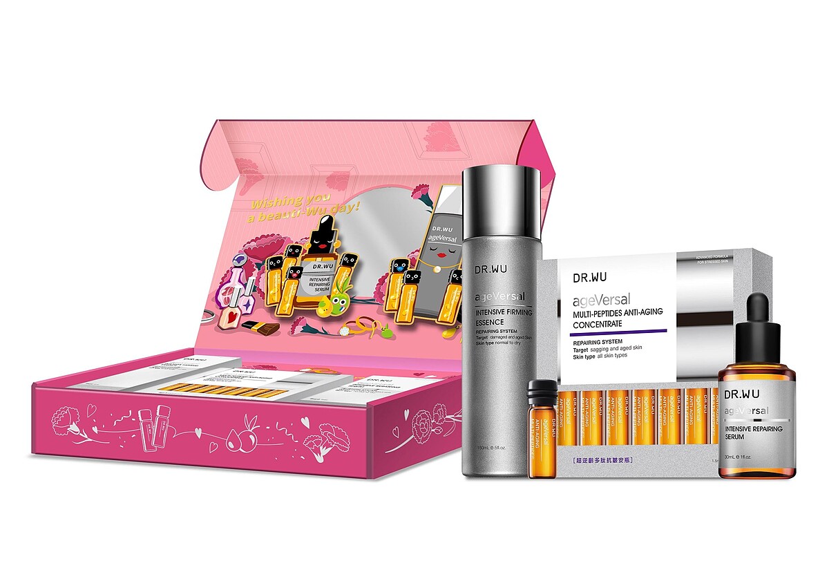 【絕對美肌全方位寵愛組】,以化妝台為設計靈感,禮盒打開後,透過可愛的圓鏡以及童趣繪畫,喚起女孩們兒時對母親化妝台的好奇與美好想像!外觀以康乃馨的插畫線條,呈現母親節的溫馨與呵護之情,全台限量價$2699!內含DR.WU超逆齡系列三大明星品 – 超逆齡緊緻精華露、超逆齡多肽抗皺安瓶以及長年美妝排行No.1的角鯊潤澤修復精華!DR.WU建議先輕拍超逆齡精華露,內含獨家「雙波緊緻胜肽科技」,透過來自阿爾卑斯山的瑞士冰河植萃肌因與4大高效胜肽,層層喚醒肌膚,開通後續保養通道,強化保養吸收力!接著搭配萃取自法國莊園的角鯊潤澤修復精華,一滴潤澤修復受損肌膚,超輕盈質地,快速吸收無負擔,最後搭配擁有10%最高濃度與10重超能胜肽的超逆齡多肽抗皺安瓶,為肌膚注入滿滿美肌能量,成就無瑕動人美肌!讓媽咪重拾年輕自信,絕對是今年孝敬媽咪的首選。