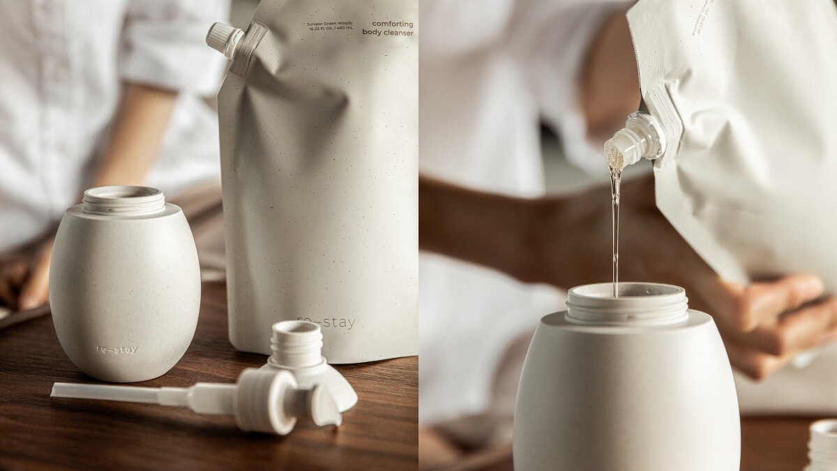最特別的是,按壓瓶刻意設計成可以重複使用的簡約外觀,如陶器般的瓶身曲線與容器概念,還可當作花瓶、牙刷架等擺設使用,減少丟棄造成的浪費。