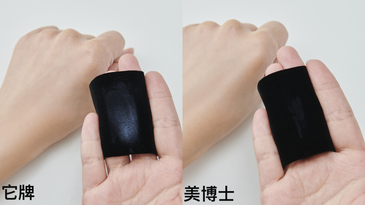 看樣子還要持續一年以上的口罩人生,防曬擁有抗摩擦力很重要!不然口罩一拿下來,防曬都掉光光了…..用黑色的布擦拭塗抹過美博士專業隔離清爽防曬乳比較一下,一眼就明白此款防曬肌膚的貼合度、持久度,透過實測顯示都讓M編真心覺得厲害~