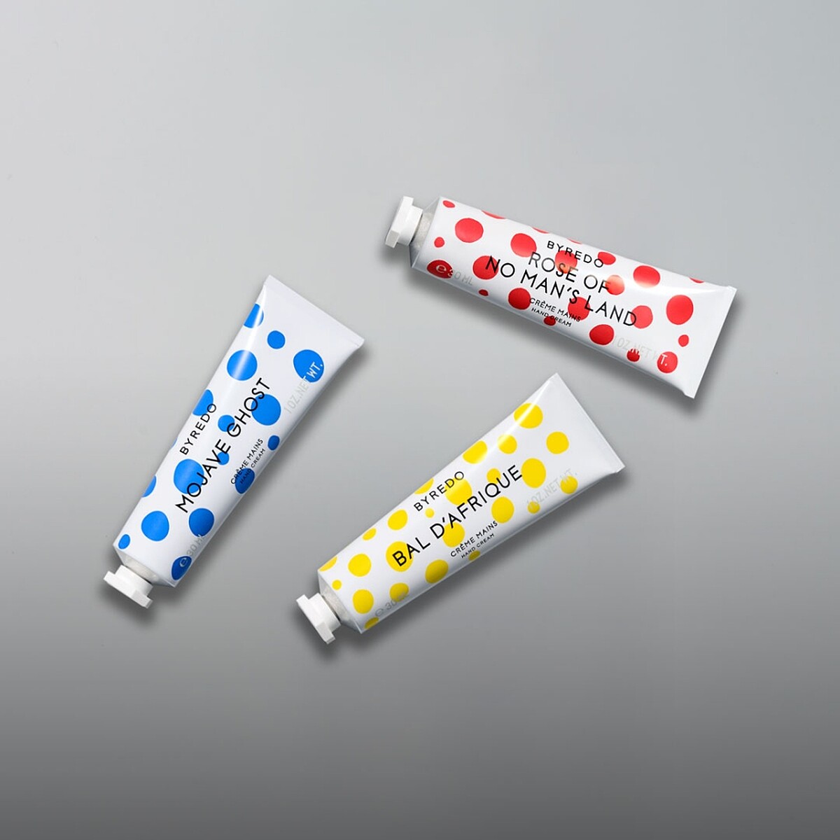 BYREDO 2021年六月推出珍藏版限量護手霜,精選三款最受歡迎的香氣:莫哈維之影、無人之境、熱帶爵士,分別換上藍、紅、黃色的圓點點,看起來超俏皮。