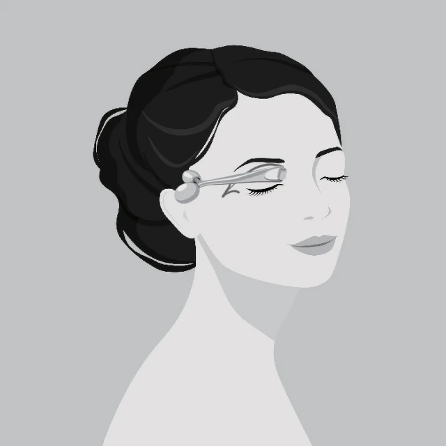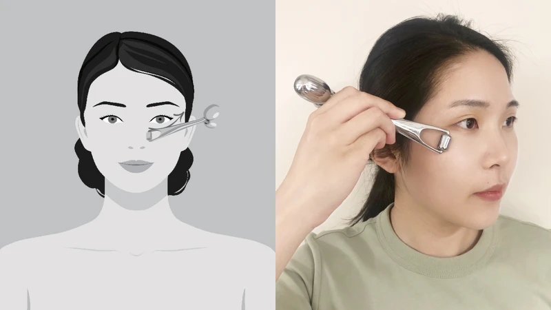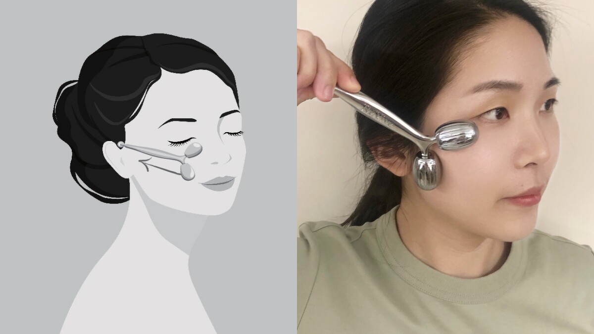 使用下方眼部專用滾輪,沿著眉毛下緣,從內側朝太陽穴的位置向外滾動,並重複5次。