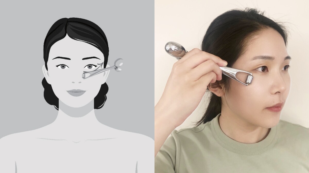 使用下方眼部專用滾輪,從眼下內角開始,朝外、往上滾向太陽穴,並重複5次。