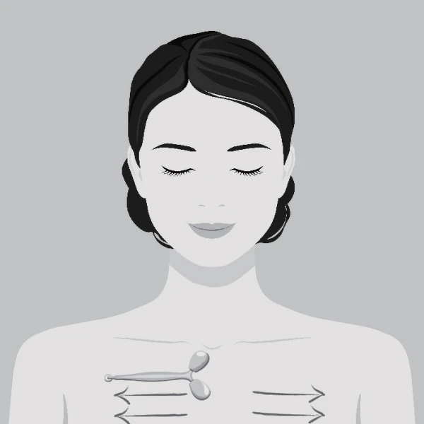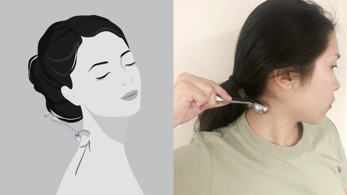 將滾輪放置在鎖骨後方的位置,往上、朝耳下的方向滾動,並重複5次。請勿在正面喉結處位置做按摩。