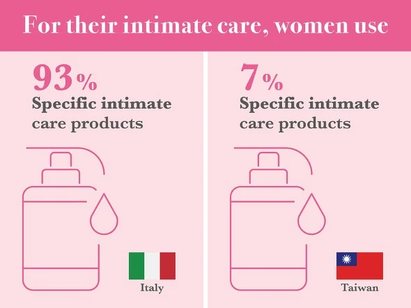 (左)為義大利女性將近93%,(右)台灣女性卻只有7%,顯示著台灣女性在私密保養的觀念遠不及義大利女性。
