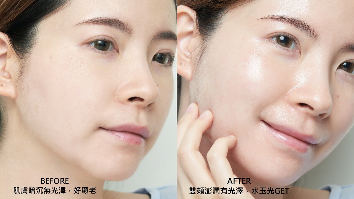 化妝水後使用,按壓兩下塗抹至全臉吸收,彷彿啟動逆齡模式,發現肌膚立刻呈現透亮光澤,摸起來好滑嫩。