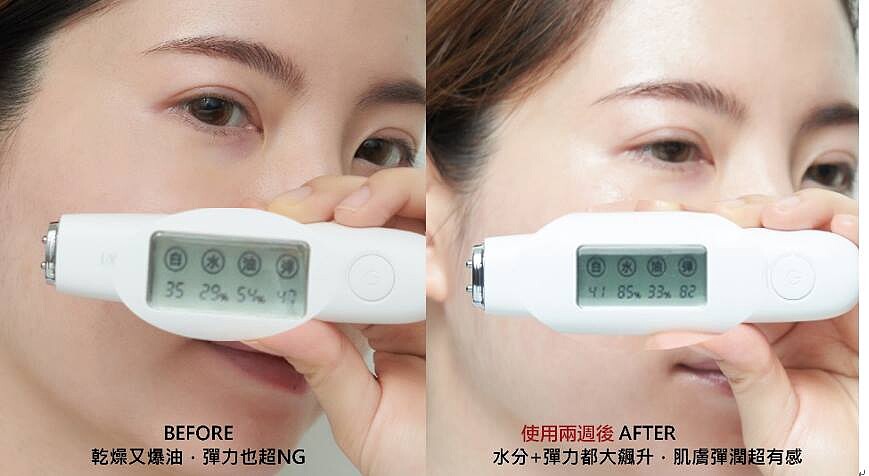 逆齡效果不只看得見摸得出,透過測試儀檢測更發現,水分跟彈力的數值雙雙狂飆!