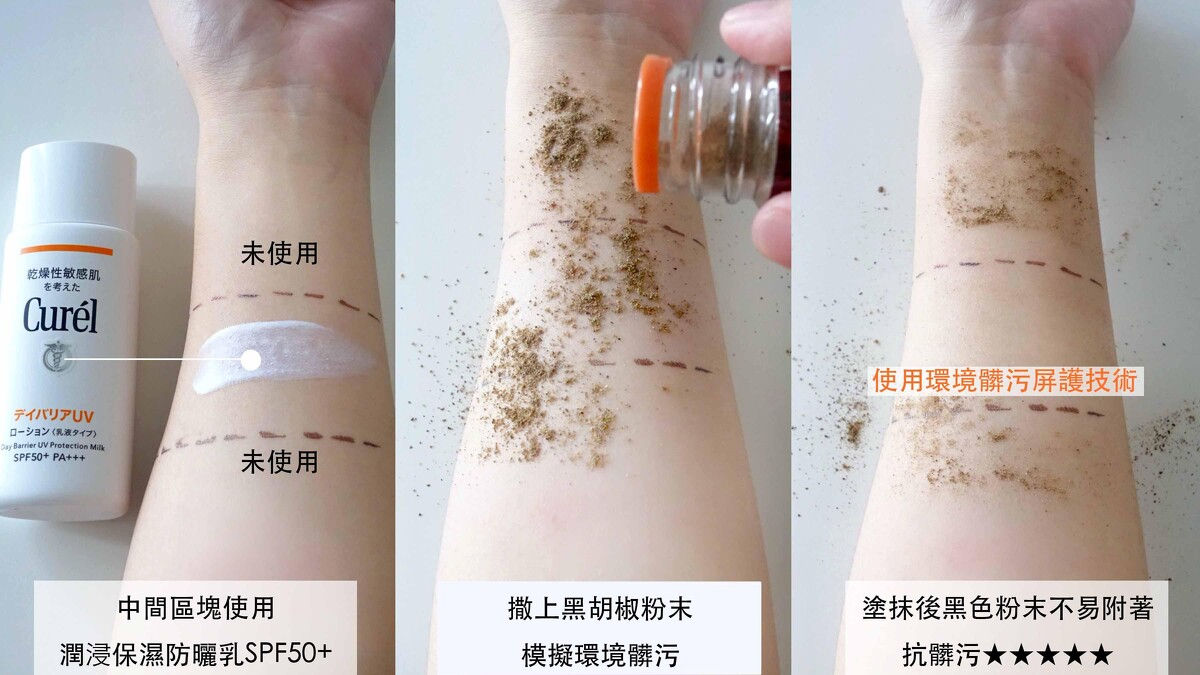 穿脫衣服、背背包或流汗,防曬乳就全部掉光光,有塗跟沒塗一樣很心酸!要防曬效果不打折,持久度真的很重要!在手背塗抹防曬乳後用黑色紙擦拭來測試持久度,擦拭後沾染較少就表示抗摩擦力好,代表持久度佳實測後持久度果然很優秀。