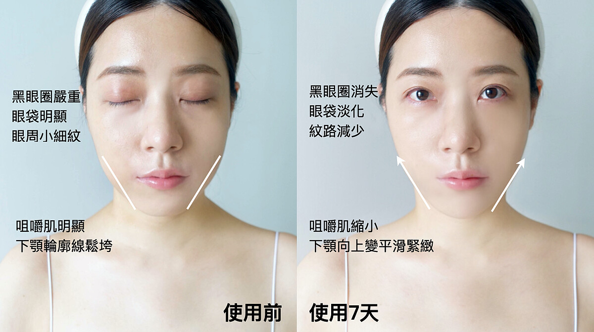 使用7天對比好不可思議~黑眼圈、眼袋全都掰、惱人紋路幾乎神隱! 最驚豔的是連咀嚼肌也變小了,就是這麼強,這麼有感,真的沒再跟妳開玩笑啊!