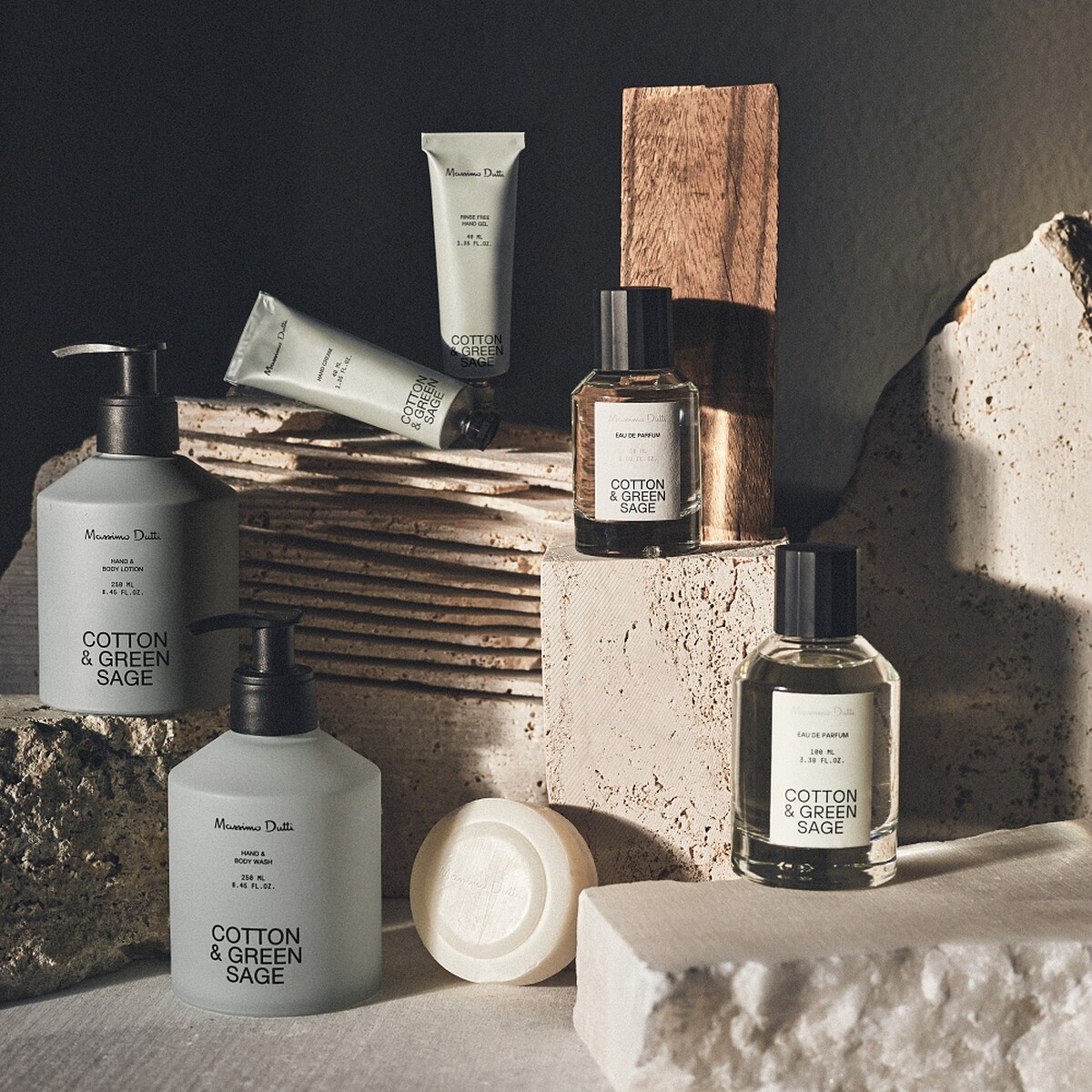 Massimo Dutti 2021年推出“A journey of a self care”個人身體保養系列,主打極簡包裝、低調色彩,強調自我探尋的生活價值。全系列目前推出四種舒緩身心的香氣(WHITE TULIP & BARLEY白鬱金大麥、CHAMOMILE & SANDAL WOOD洋甘菊檀香、COTTON & GARDEN SAGE棉香鼠尾草、JUNIPER BERRY & GINGER 杜松子生薑),每種香氣底下都有六款單品,包括香水、乾洗手、護手霜、手部/身體清潔乳、手部/身體乳液以及肥皂。