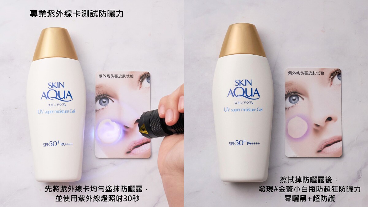 透過紫外線測試卡來測試防曬效果,可以發現有塗抹防曬的圓圈內,即使用強烈的紫外線燈照射下,依舊維持零曬黑,超強防曬力真的有夠威。