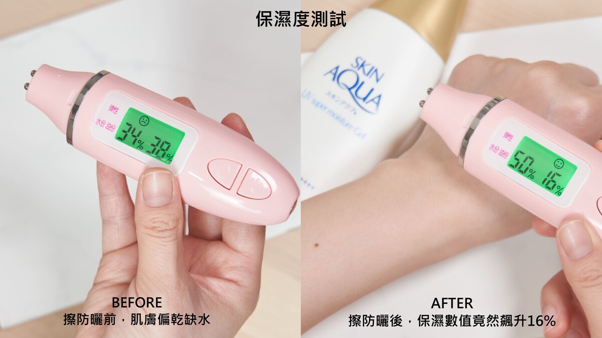 透過水份檢測儀可以看到,沒想到擦了防曬比沒擦還要保濕,水分狂飆16%,簡直就是開架防曬的天菜等級!清爽不黏膩,還讓妳不曬黑,而且擁有保濕水感,誰能不愛!!