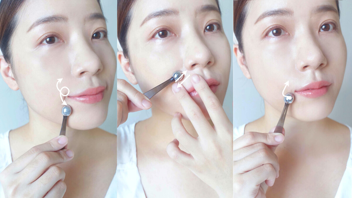 接著針對唇周3步驟精雕細琢。1. 上緊法令紋: 使用深海銀光棒針對法令紋上下滾動,淡化細紋 。2. 下撫上唇紋: 平行滑動深海銀光棒,緊緻上下唇紋 3.內澎木偶紋: 以L手勢向上拉提,改善嘴角下垂,打造完美微笑線。
