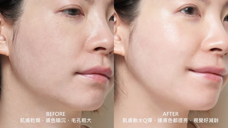 沒想到持續用下來的效果愈來愈驚豔~長時間戴口罩摩擦到很乾癢暗沉的肌膚,竟然變得好穩定、好水嫩,重點是摸起來好細緻好彈嫩,整體膚色也變透亮又飽滿,不敢說重回少女時代,但也有-5歲的逆齡既視感。