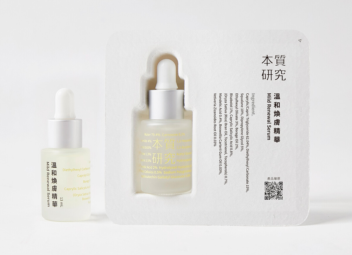 榮獲2021金點設計獎標章、2021微笑化粧品選拔的保養品牌-本質研究,推出溫和煥膚精華,創新打造無水配方搭配頂級護膚油,嚴選好油養肌,不只能修護抗氧化,還能汰換臉部老舊角質。
