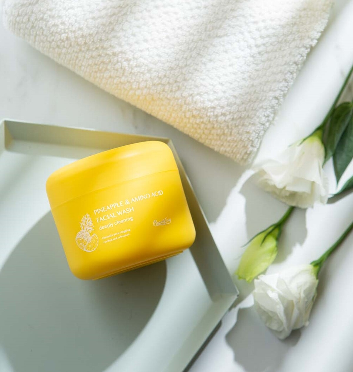 結合鳳梨萃取天然酵素、高達30%的胺基酸溫和洗淨成分,以及維持肌膚健康彈性與平滑勻亮的維他命E,配方單純且無添加酒精、皂鹼的「鳳梨酵素洗面霜」,能幫妳爽快地與粗毛孔、粉刺漂亮分手,一年四季每天早晚,洗出帶有潤潤保濕感,老廢角質與粗糙暗沉一併被帶走的細嫩水感好膚質。