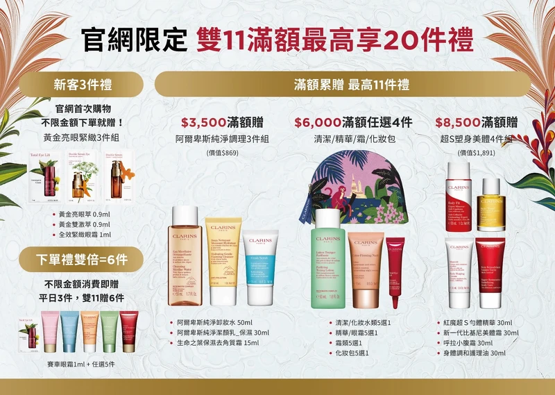對於還沒體驗過克蘭詩美肌天堂的朋友們,現在進場正是時候,別家沒有的新客人尊寵待遇,消費不限金額就送亮眼緊緻三件組(包含:黃金亮眼萃0.9ml、黃金雙激萃0.9ml、全效緊緻眼霜 1ml),還沒完喔~如果你是11/1-11/10 下單加碼再送六件禮,等於新朋友立刻GET九件相見禮,別以為領完就沒了,想要繼續囤貨依舊可以獲得雙11限定六件禮,這份大禮是否過優!!!