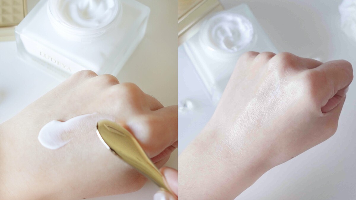 最特別的是LUDEYA金磚霜使用獨家調製的精油香氛,用聞的等於已經開始做保養,夜間保養第一步直接抹在手掌心搓揉加熱,靠近鼻子嗅聞,淡淡的高雅清香氣息果然讓忙碌整天的身心壓力馬上得到舒緩,肌膚放鬆吸收度也會更好。