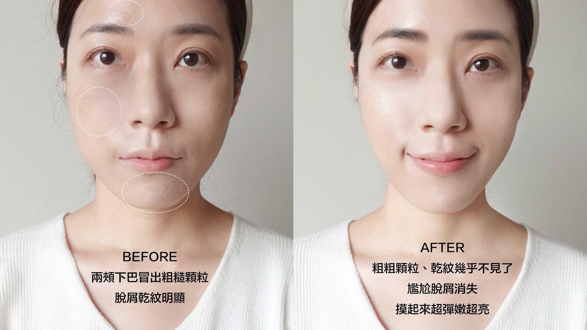 一週前上妝後粗粗顆粒的臉頰和下巴超級明顯,只能用慘字形容!高濃度修復成分真心太威,使用一週的膚質進化超驚人完全看不出一週前的爛臉實況。