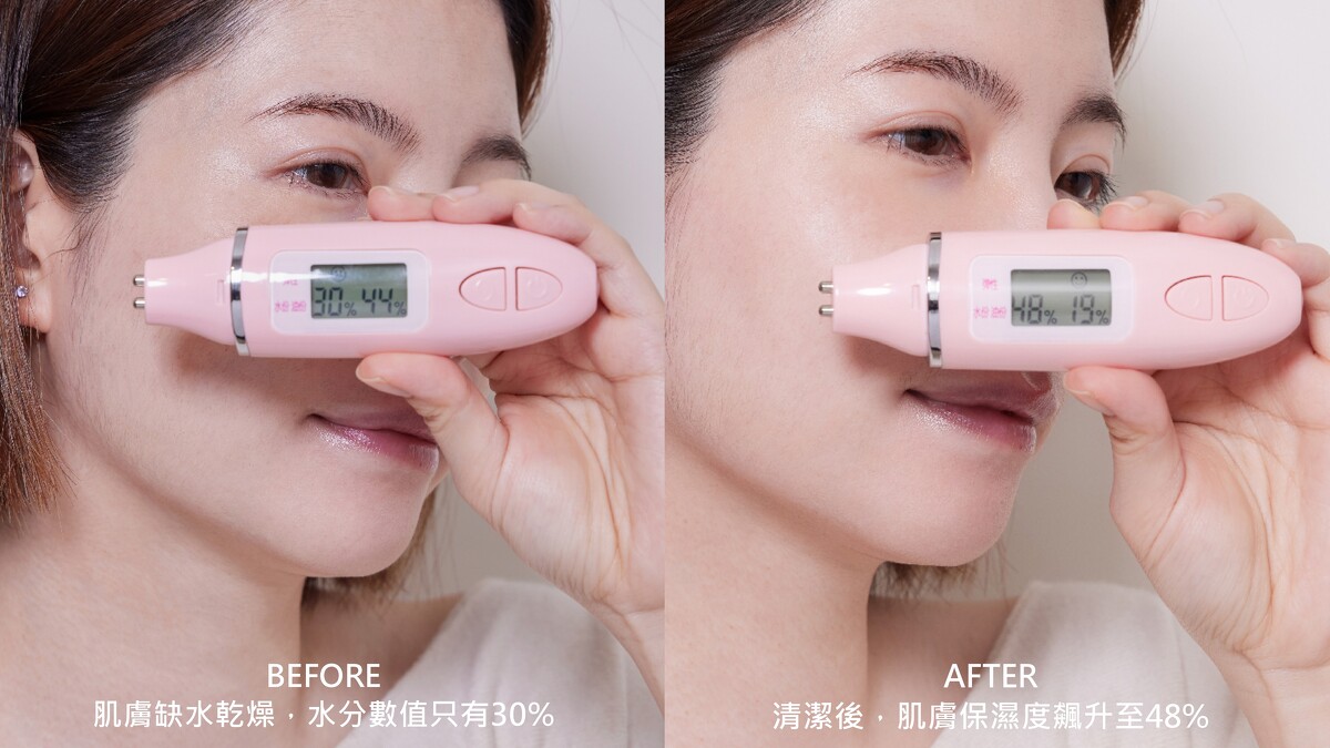 不誇張,肌膚卸完妝竟比卸妝前更保水!數字會說話,帶妝的肌膚缺水又乾燥,水分只有30%,卸妝後肌膚水分上升至48%,整整飆升18%有夠驚人!!