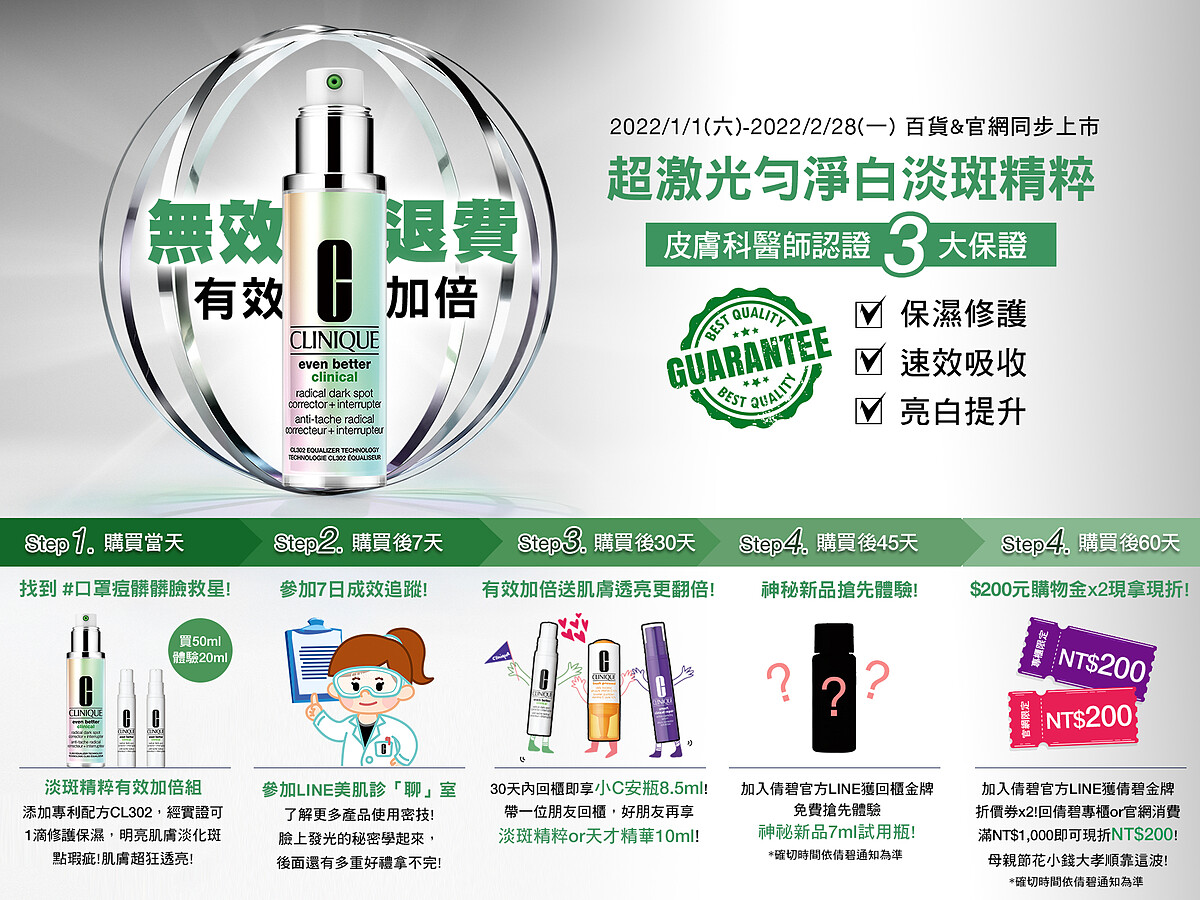 相信你也有這樣的經驗~在專櫃現場試用、或拿試用包回家用一兩天,感覺好像很不錯開心買了正貨回家,結果用一週才發現與膚質不合,想退貨卻已拆封,只能束之高閣放到過期或拿來擦手擦腳……會有這樣的窘境,因為你用的不是倩碧!2022年倩碧開春就送出寵粉大紅包~推出#超激光淡斑瓶開春虎虎生風活動,就是要包你滿意、無效退費!