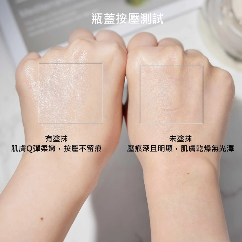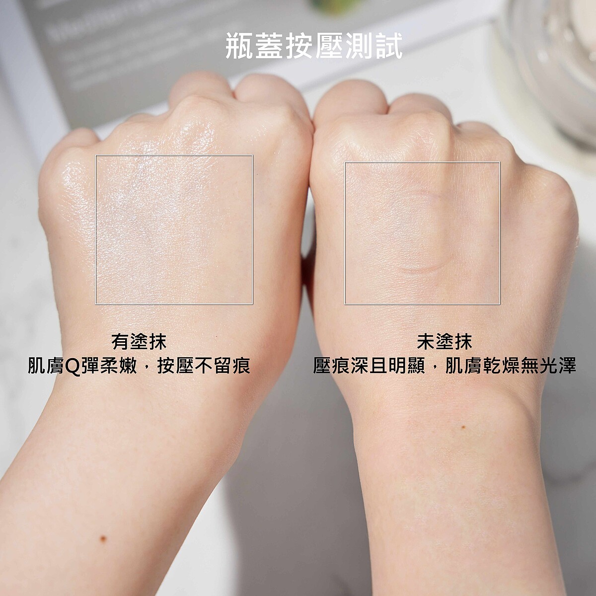 摸得到的細緻柔嫩,竟然也能看得出來?用瓶蓋按壓手背肌膚來測試柔嫩度,有塗抹NO.1乳霜王的左手壓痕幾乎看不出來、肌膚澎潤又Q彈,而未塗抹的右手不僅壓痕深又明顯、肌膚還很乾燥無光澤。