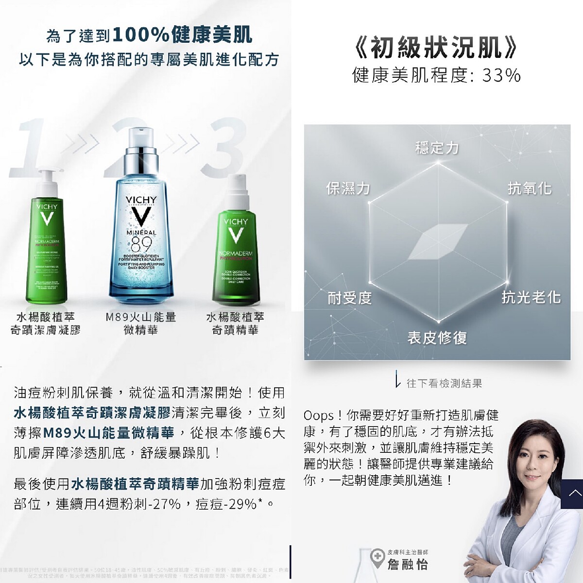 想要知道自己肌膚目前的狀況,以及針對問題來改善?史上最貼心的薇姿這次與皮膚科主治醫師詹融怡醫師合作,提供「線上沉浸式美肌檢測」,只要用手機回答簡單問題,就能了解自己目前肌膚的健康程度,最後也會針對肌膚狀況來推薦專屬進化配方,只要用對保養就能美的很輕鬆。