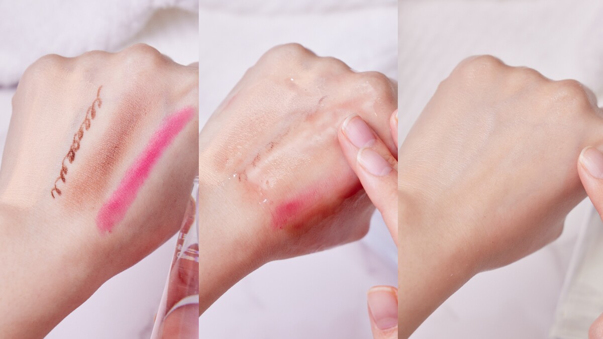 先在手背上測試,畫上持久粉底液+防水眼線膠筆+眼影+持色唇膏,各種難纏彩妝幾乎秒被KO,根本來不及拍就被卸光光,卸妝效果有夠威!!