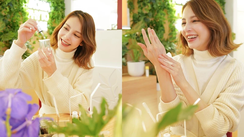 2.深冬時節加一滴在粉底中上妝,面部護理油滋潤不油膩的親膚保養力,讓底妝更貼、更亮、更持久。