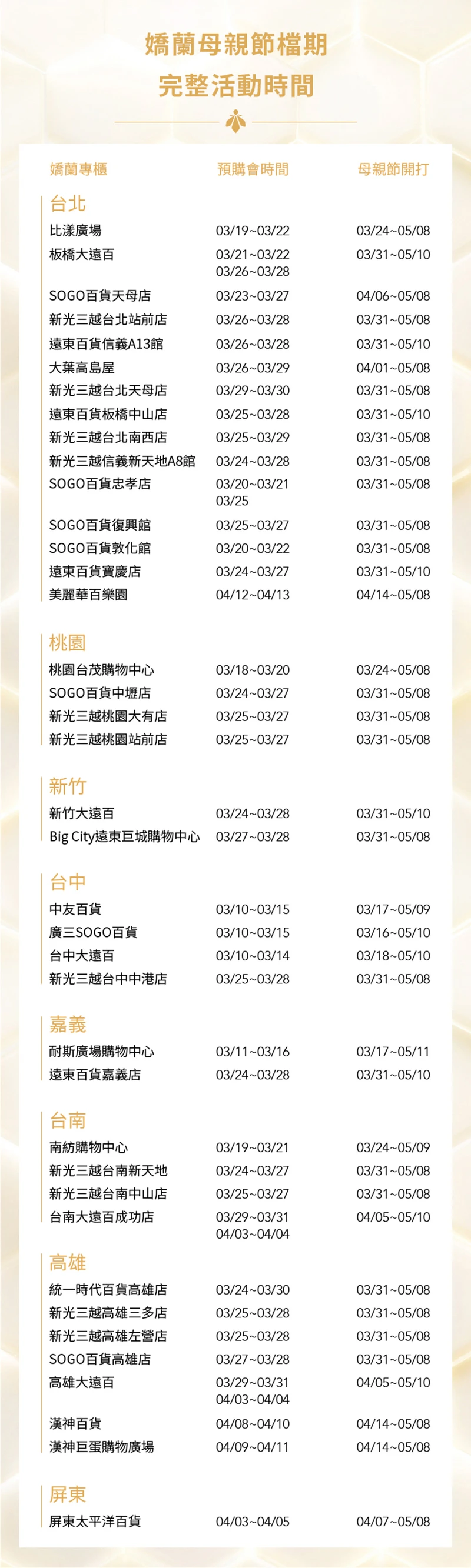 看完大家是不是跟M編一樣迫不急待想要嬌蘭逛起來!奉上完整活動檔期,各百貨限定eDM也在裡面了
