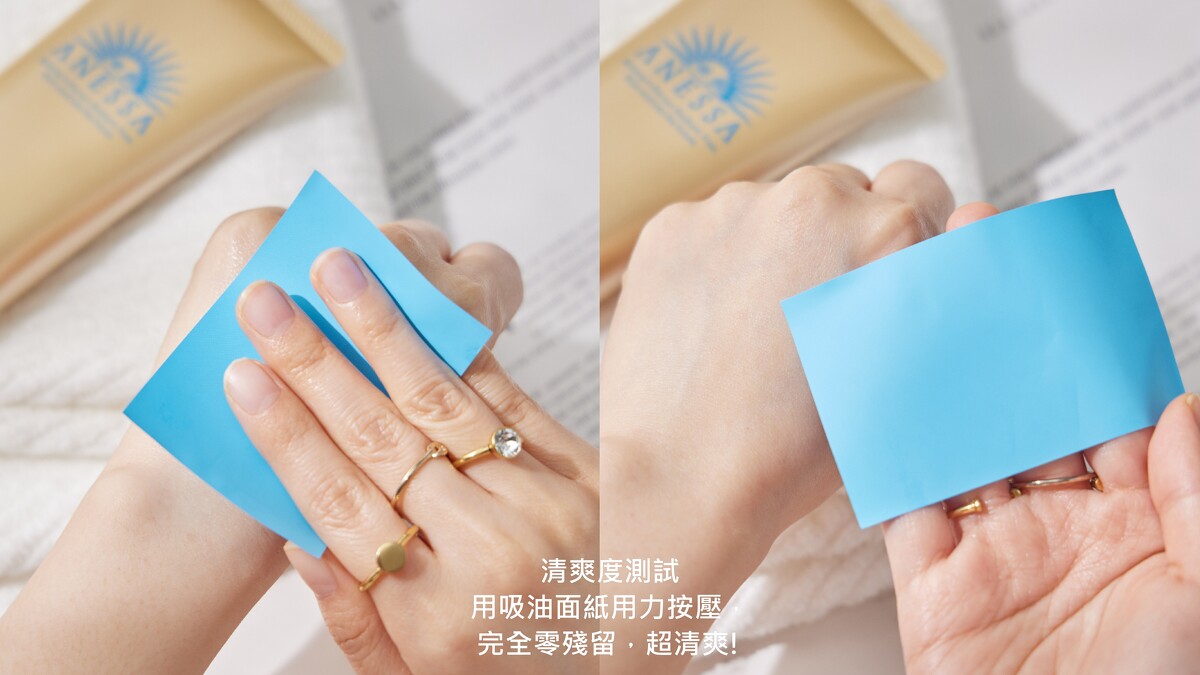 清爽度測試:用吸油面紙實測,質地真的很清爽不油膩,用力按壓吸油面紙上完全零殘留!