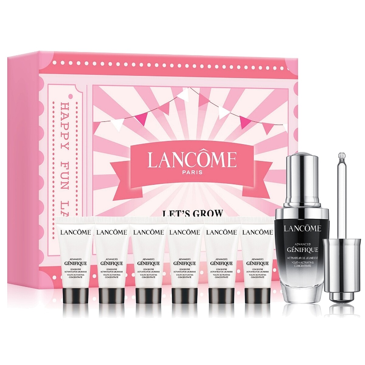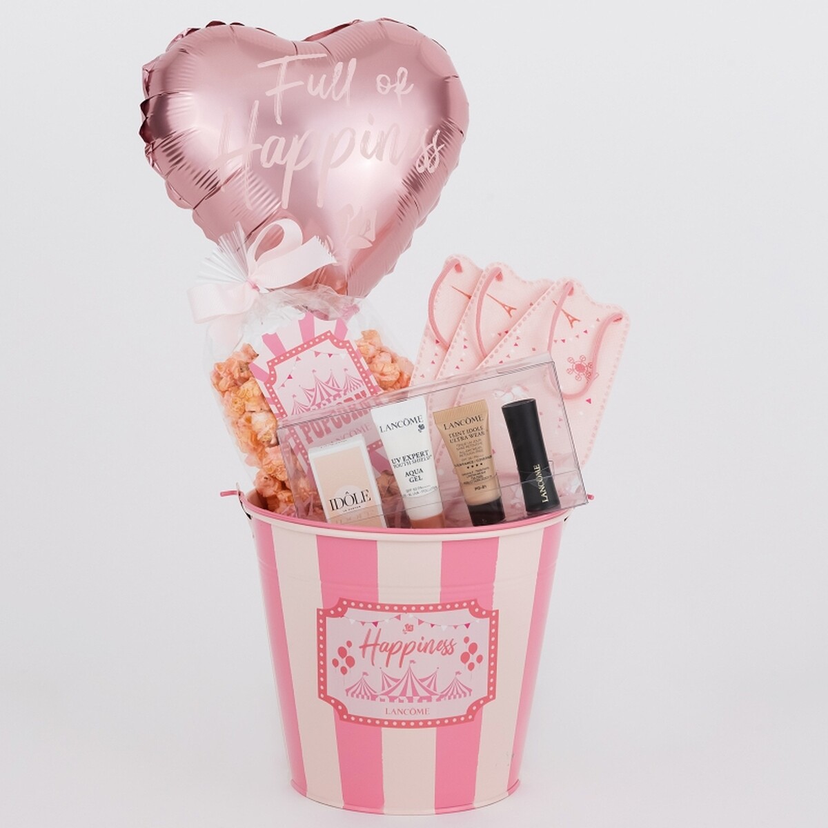 蘭蔻更將限量送出可愛滿點的「幸福爆爆桶」,3/31至指定蘭蔻專櫃購買任一排隊發燒組(小黑瓶買1送1、極光水買1送100),即贈內含經典熱賣體驗組、超Q粉紅爆米花、粉紅樂園立體口罩等三項幸福禮物的「幸福爆爆桶」,讓所有粉絲帶回蘭蔻誠心獻上的甜蜜心意。