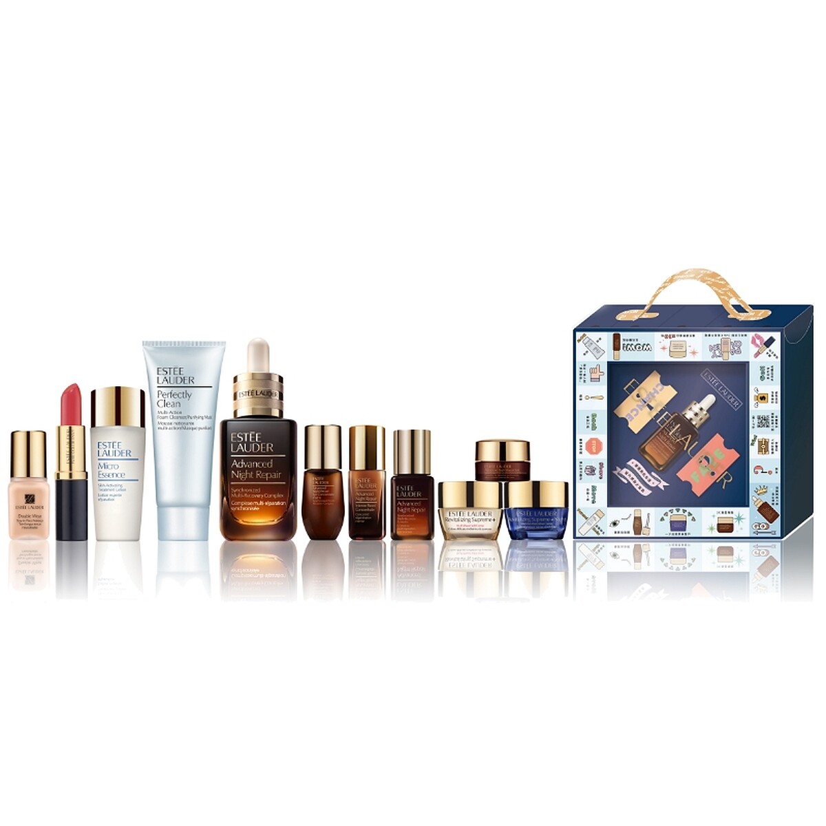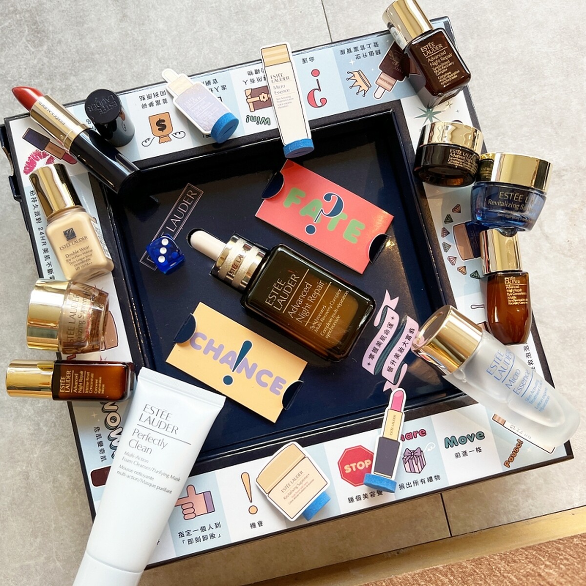 精心設計超趣味的大富翁跳格子外盒,內附超可愛明星產品小棋子與骰子,更驚喜的是內附機會與命運卡牌,可隨機翻出豐富獎品,成為名符其實美妝富翁。卡牌可能是NT1,000折價券或贈品券,最大獎是精華霸主小棕瓶一年份(50ml*4),抽中直上小棕暴發戶。